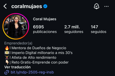 Con su método consiguió que su mujer, Coral Mujaes, pasara de 70 mil seguidores falsos (guiada por “agencias de marketing” a comprar dichos seguidores” a una comunidad de más de 8 millones de seguidores en todas sus redes sociales.
